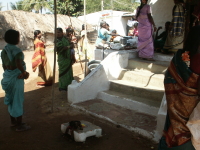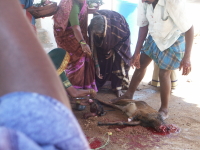 ![]() 最初のお祭りは、アキとサキがHAMPIを出発した日だった。部屋の前にある広場に祠があって、子供たちや年寄りたちの憩いの場になっているところがある。その祠のお祭りで、そこの周りに住む人々だけで行う小さなものであった。いつもは何もない広場にタープのようなものが建てられ、子供から老人まで集まっている。不思議なことに、NETRAをはじめゲストハウスの経営者や目の前のキオスクのおばちゃんたちは、きれいな服を着てはいるけど儀式には参加していない。何か特定の人々によるお祭りなのかもしれない。そのうちに、楽団が先頭に立ち、祠の周りに布によって道が敷かれ、そこを生贄となる子山羊が引き回される。老人たちの歌うような祈りの中で、山羊の頭が刎ねられ、祠に供えられた。残りはきれいに解体されて、カレーになっていく。この日ばかりは肉を食するのだという。老婆たちのお祈りは断続的に夜中まで続き、最後には祠の前で眠りについていた。 |