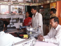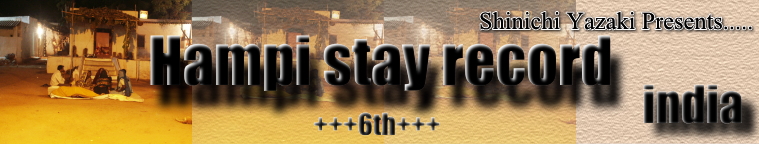 あるときはシャクーが新しいミシンを買うというので、3人で一番近くの町HOSPETまで出かけてことがあった。土産に紅茶やカレースパイスを買いたかったので、ちょうど良かった。一人で行くより知っている人と行くほうが何かと気が楽だし、行きも帰りもリクシャーで、贅沢なわりにゆっくりと間の景色を楽しめた。ミシンを買う段階になって、金が足りなかったらしく、マヌーに頼まれて900ルピーほど貸したのだが、今思えばそのときすでに何の疑いも持っていなかったなオレ、と思うとおかしい。最初なら絶対にないことだから、かなり近しい間柄になったものだと思う。実際にその夜お金を持ってきてくれたしね。で、早速ミシンを組み立てようとしたのだが、工具がないのでなかなかうまくいかない。そのうち腹も減ってきたので、またマヌーのところで遅い昼飯をご馳走になることになった。ご飯に再びシャバシャバのカレー、揚げたチャパティを食う。この暑さの中で冷蔵庫もないので、かなり不安はあったのだが、もしあたったら、それは運がなかったと思うことにした。それでも最後に進められたクードライス(ヨーグルトご飯)はさすがにヤバイ、と思ったのだけど、結局うまいうまいと食ってしまった。![]() マヌーのところではHAMPIを出る朝にも朝飯をごちになった。みんな別れを惜しむというより、次は何時会えるのだろうという期待のほうがあるみたいで、ずっと笑っていた。みんな幸せにずっと笑って生きていって欲しいと思った。 |