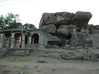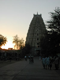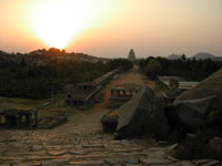 Hampiには3時に到着。予想はしていたがこれほどとは。とにかくあつ−−いのである。Hampiは14世紀のヴィシャヤナガル王国の都で多くの遺跡があり世界遺産にも登録されている静かな観光地である。約150mがメインバザールでトゥンガバドラー川とバザールの間に住居やゲストハウスが密集している。長い移動と寝不足、そして半端じゃない環境の変化にフラフラになりながら、本能の鼻を利かせてゲストハウスの密集地を見つけ、一発目に声をかけてきたおっちゃんの部屋に決めてしまった。普通はいくつか見て決めるのだが、カーブの角におっちゃんの店があり(服屋なのだかチケットの手配や自転車も貸している)曲がってすぐの部屋を見事な手際で見せられ、蚊やつき、シャワートイレ室内、150ルピーと思っていた条件なので、早く気を抜きたかったのであっさり決めてしまった。しかしながら、この後いい加減な決断がHampiでの生活を居心地のいいものとしてしまうことになった。